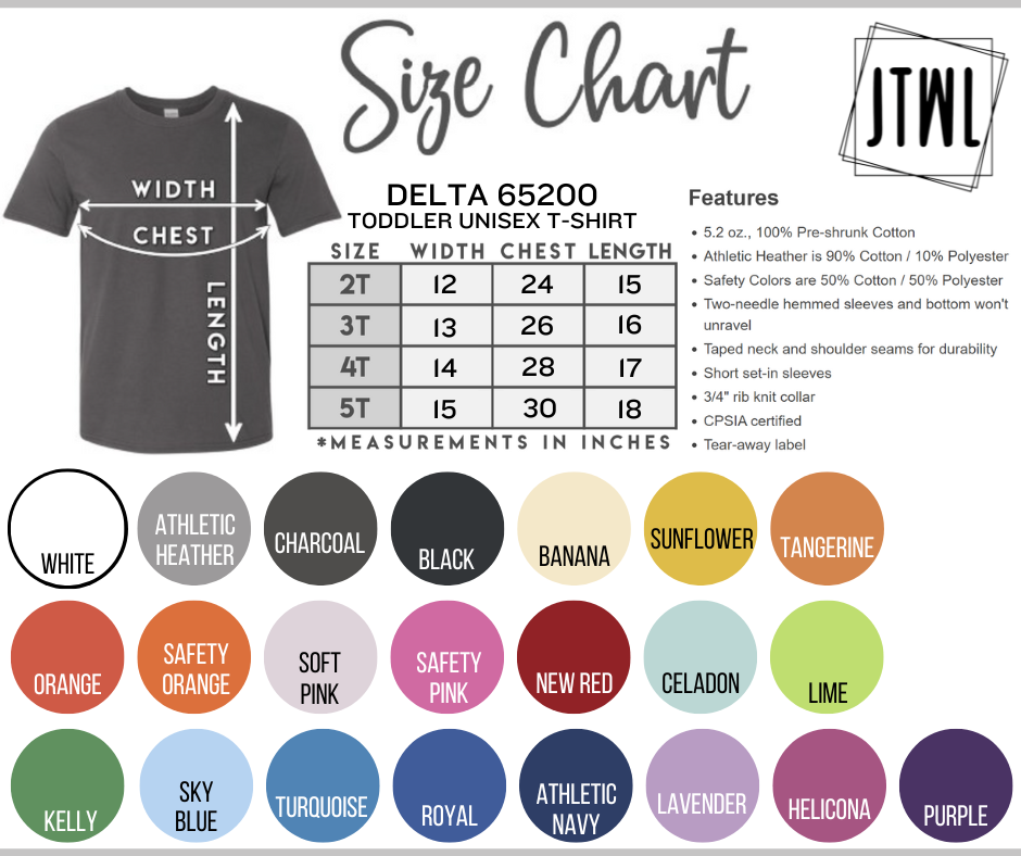 Please list your preferred size & color tee above. Tee is short sleeve, crewneck; unisex sizing. Please see size/color charts for your preferred size's available color options.