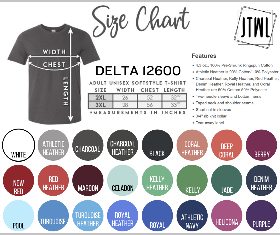 Please list your preferred size & color tee above. Tee is short sleeve, crewneck; unisex sizing. Please see size/color charts for your preferred size's available color options.